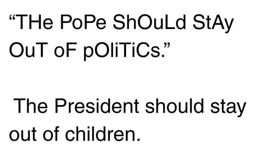 it’s so galling, watching all these hypocrites telling the Pope to zip his fool mouth about religion, if he knows what’s good for him. these are the people who have never once shut the fuck up about how there needs to be more religion in government. these are the same loudmouth zealots who are so horny to force their vision of prayer in the schools — and the Ten Commandments in every classroom — on We the People.