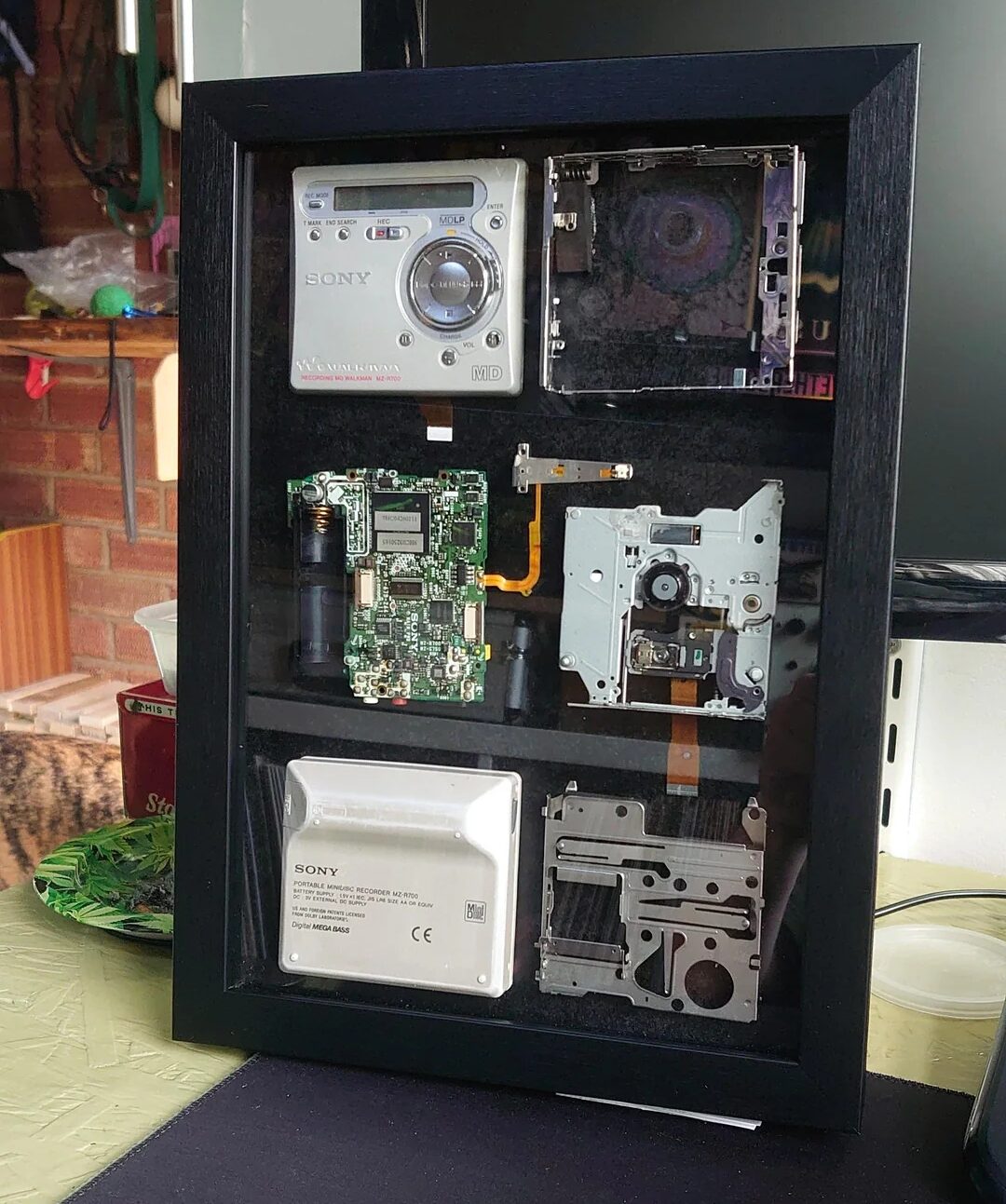 Inspired by this photo as well as a video from a few months back I can’t seem find anywhere now, I decided I’m going to try this myself. I’ll buy up a few cheap “non-working” or “untested” MD players, disassemble them, and mount them in a shadowbox like this. Hardcore Minidisc fans will lay out good cash for this shit…