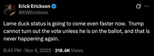 let’s give Erick, the Son of Erick, credit for at least recognizing that Donny can’t ever run for president again — something that all the Chinese-made “Trump 2028” hats in the world can’t change.