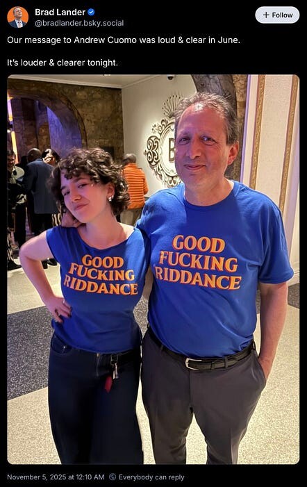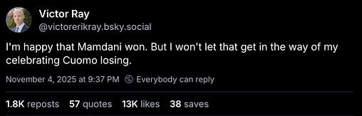 “I’m happy that Mamdani won. But I won’t let that get in the way of my celebrating Cuomo losing.”