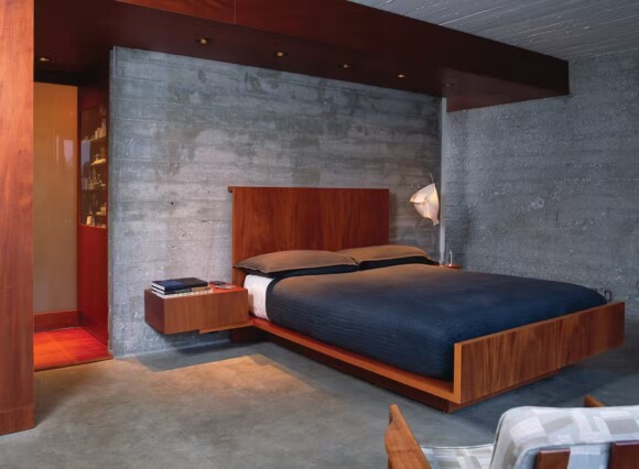Would I be forgiven if I painted the gray concrete walls a nice, warm peachy tone, and got rid of the Holstein upholstery (being a vegetarian, I don’t want the reminder that anything leather comes from cow or bull). Loving the wood finishes, however.