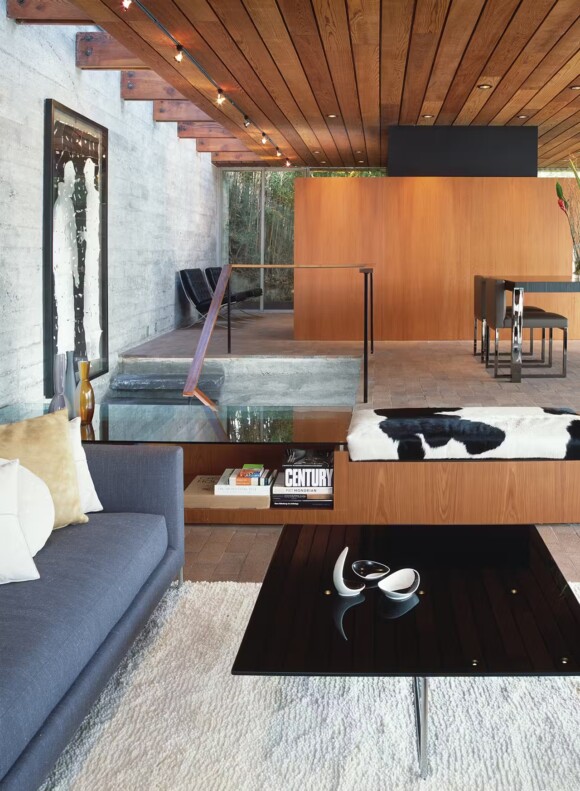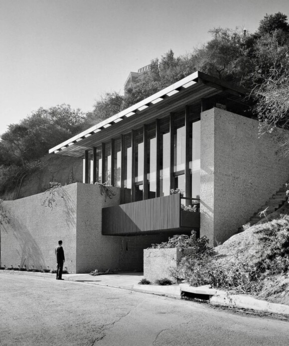 Built in 1962, this Modernist home in Los Angeles was designed by architect Carl Maston as his personal residence. Because of the steeply sloping site, the swimming pool had to be placed in the front—cleverly hidden from the street by a walled embankment.