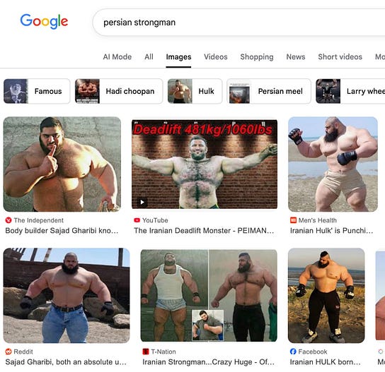 oh, and because I’m a responsible journalist and everything, I wanted to know exactly what a ‘Persian strongman’ is, so I googled it. here’s what I got.