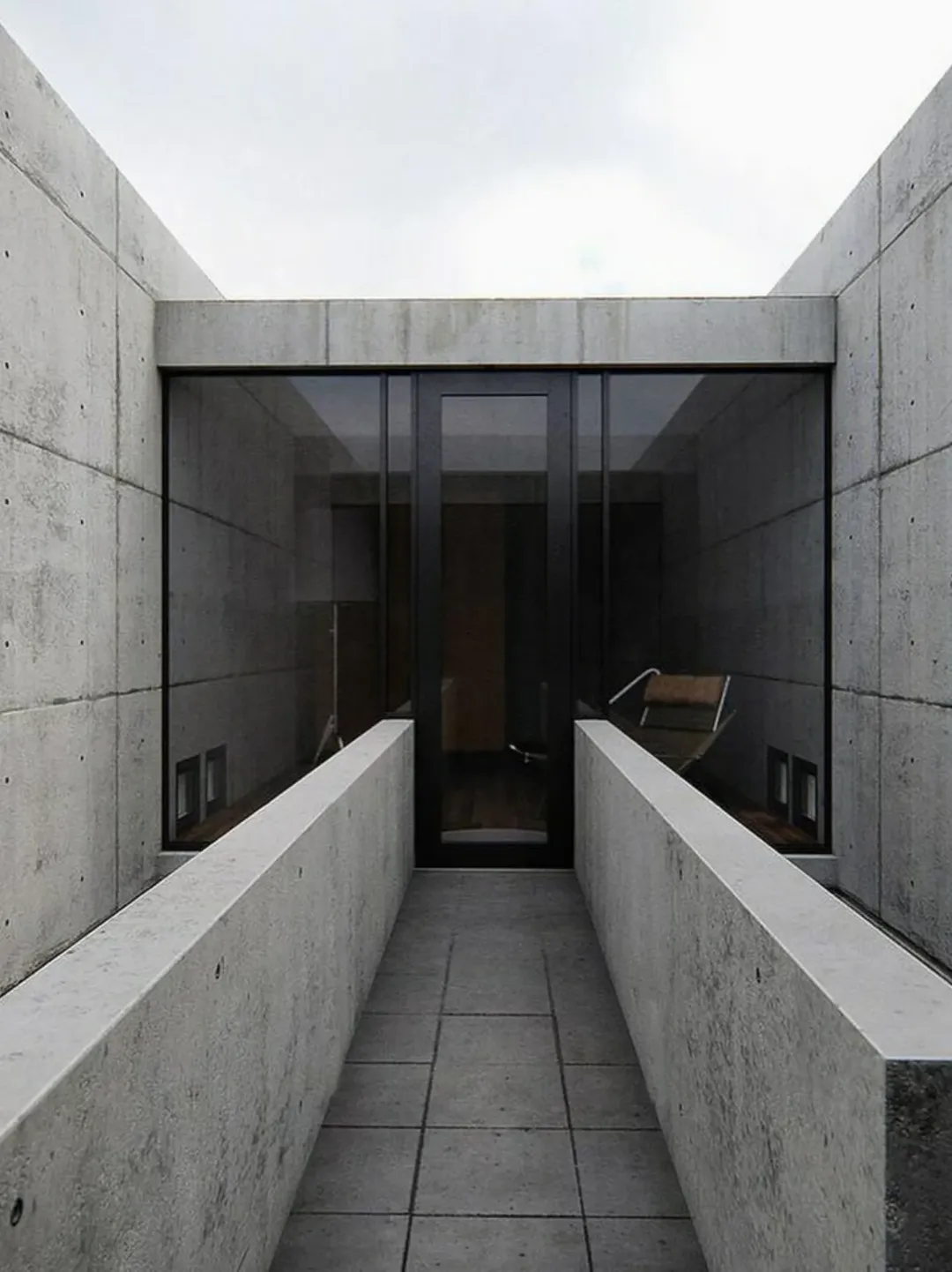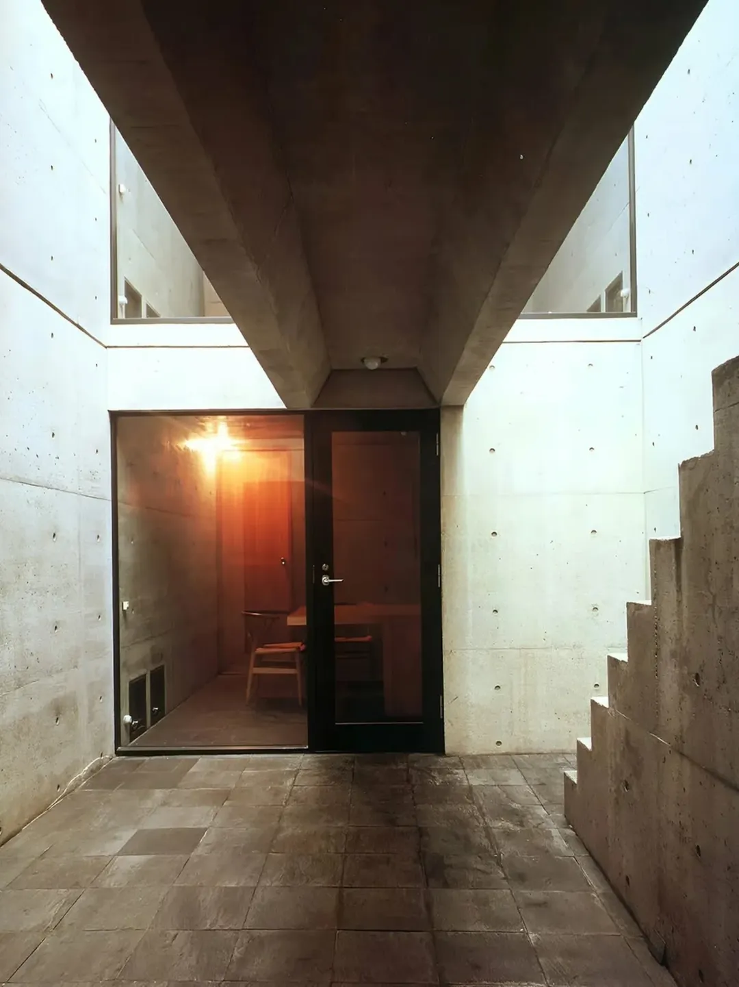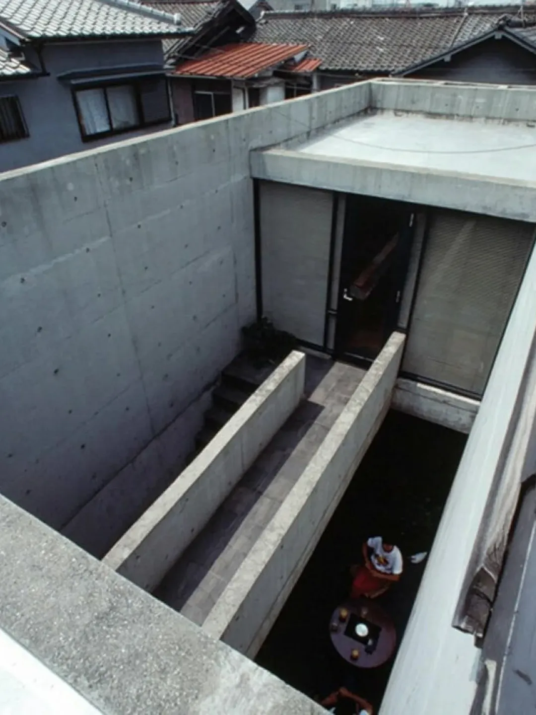 In 1976, architect Tadao Ando designed the Azuma House in Sumiyoshi, Osaka, Japan. The residence occupies a narrow plot between two traditional wooden row houses. It was built with smooth reinforced concrete and features no street-facing windows.