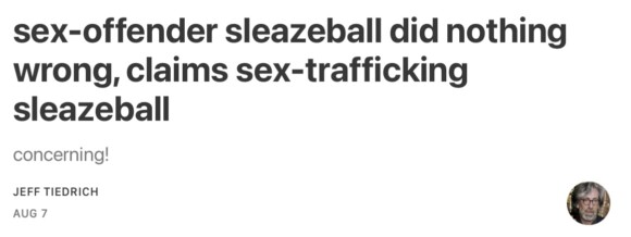 it seems that the sleazy convicted sex trafficker who used to hang out at the sleazy adjudicated sex offender’s sleazy golf motel in order to procure teenage girls for the sleazy adjudicated sex offender’s sleazy dead pedo bestie told the sleazy adjudicated sex offender’s sleazy personal lawyer that she never saw the sleazy adjudicated sex offender do anything wrong.
