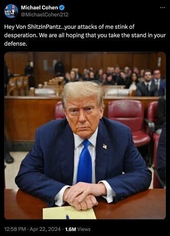 Todd Blanche will be for the rest of his life known as the buffoon who stood up in court and tried to convince a judge that it was okay for his client to violate his gag order — because Michael Cohen called him Von ShitzInPantz.
