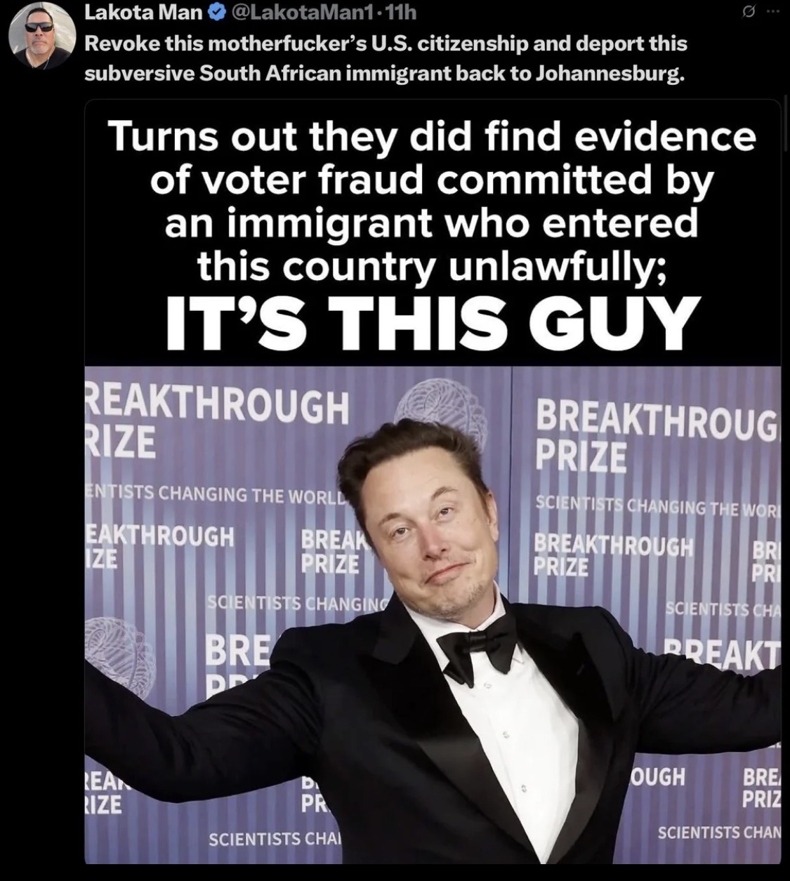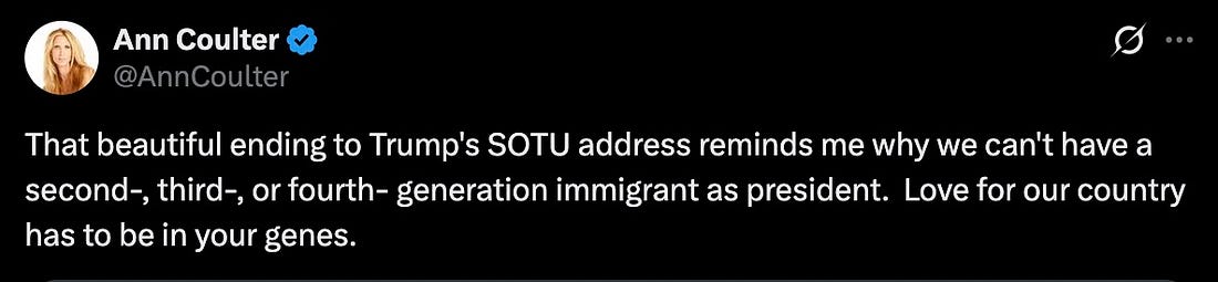 “That beautiful ending to Trump’s SOTU address reminds me why we can’t have a second-, third-, or fourth- generation immigrant as president. Love for our country has to be in your genes.”
