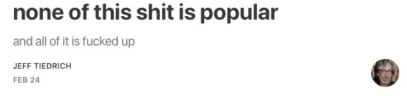 to all the people who have signed on in the days since the election, welcome aboard. settle in as we all try to deal with the shitfuckery that’s ahead of us.
