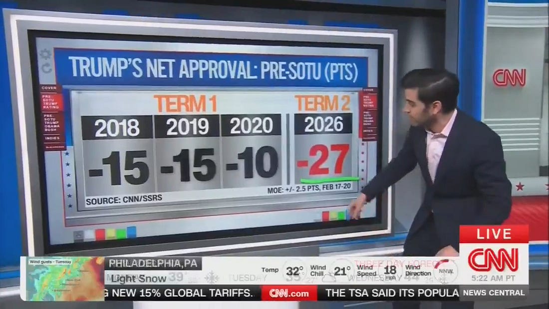 CNN’s Harren Enter: “Trump’s net approval rating. look at the pre-SOTU polls, the State of the Union. look at that — negative 27 points! my goodness gracious. Compare that to where he was in 2020, 2019, and 2017 — minus 10, way lower now. the bottom line is Donald Trump has never been weaker going into a State of the Union address, according our CNN polling than he is right now, and weaker by a considerable amount.”