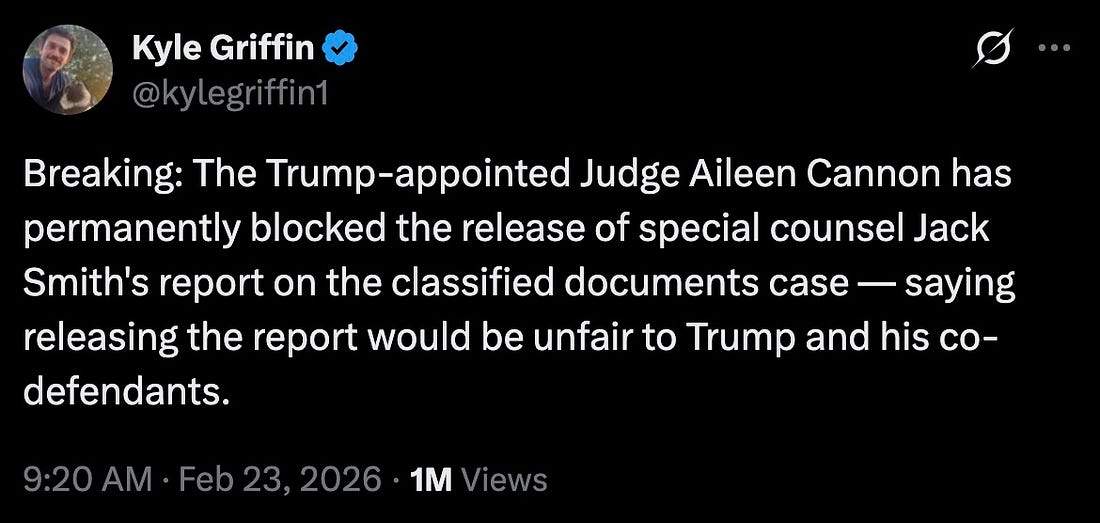 “Breaking: The Trump-appointed Judge Aileen Cannon has permanently blocked the release of special counsel Jack Smith’s report on the classified documents case — saying releasing the report would be unfair to Trump and his co-defendants.”