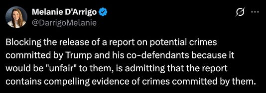 “Blocking the release of a report on potential crimes committed by Trump and his co-defendants because it would be ‘unfair’ to them, is admitting that the report contains compelling evidence of crimes committed by them.”