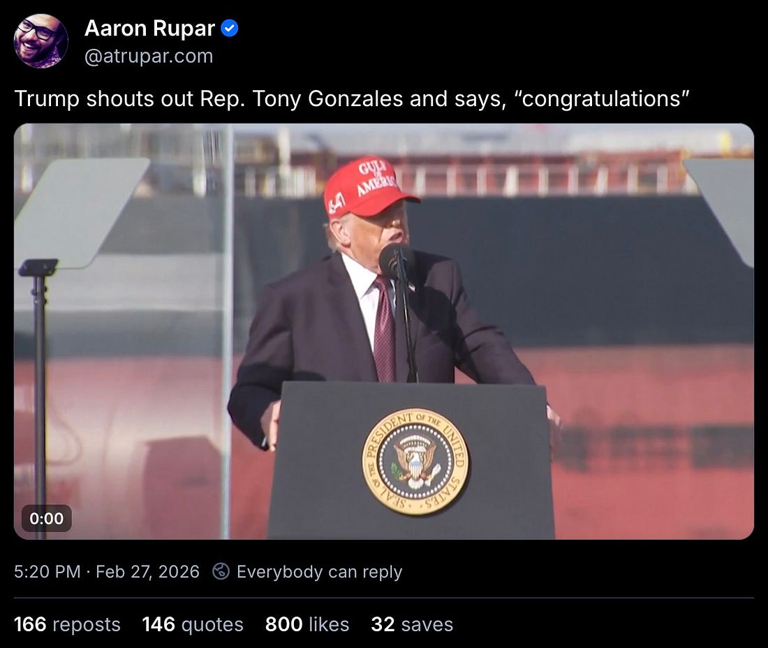 Tony Gonzales, it must be noted, is currently being pressure to resign from Congress over allegations that he coerced a sexual relationship with a staff member who later killed herself. so what the fuck is the fucking idiot congratulating him for?