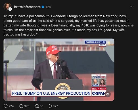 my dear sweet lord. it was just last week that the entire media ecosystem dogpiled AOC, because she paused and said ‘um’ in the middle of an answer — but Donny somehow gets an endless series of free passes to shit out incoherent nonsense on a daily basis. nobody in the press blinks, nobody says boo. it’s fucking maddening.