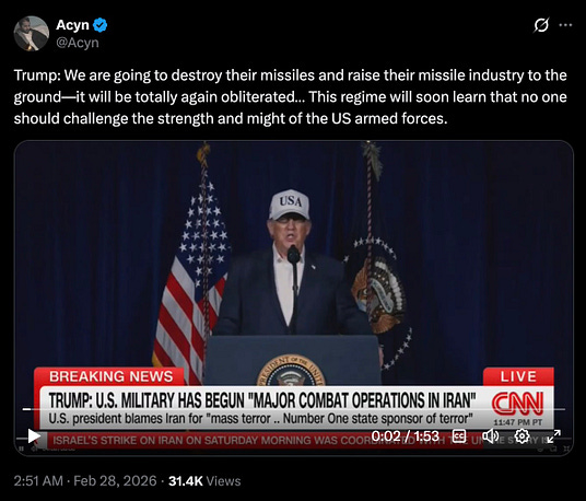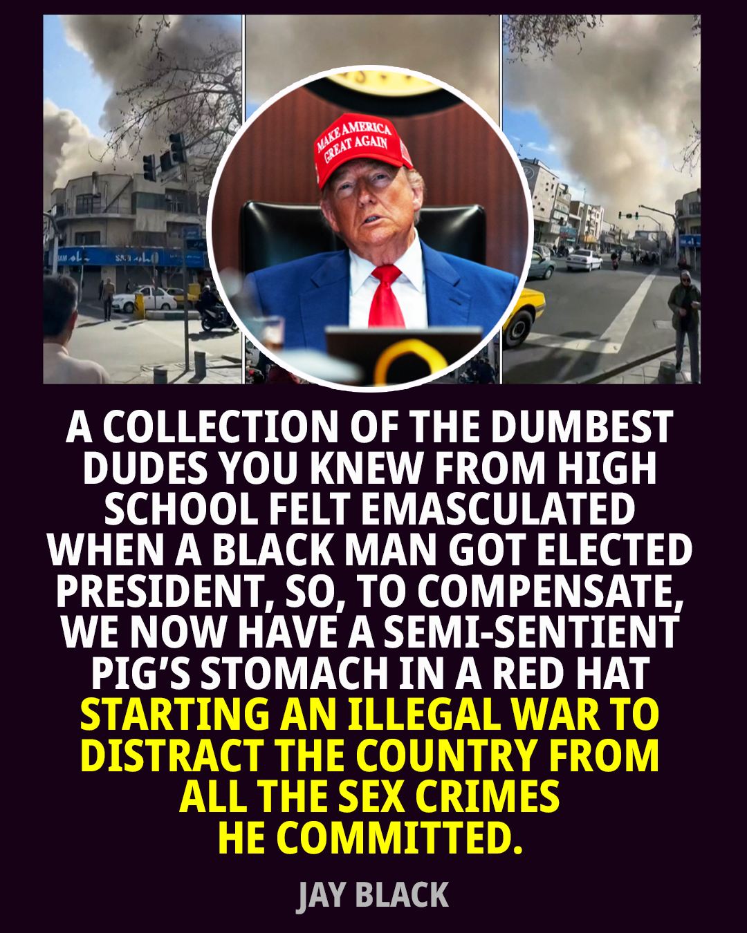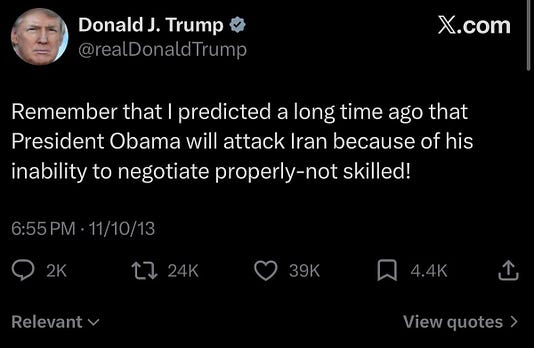 and then, in the middle of the night, we all found out that — holy fucking shit — the fucking idiot has now taken us to an unprovoked and illegal war with Iran, because obliterated.