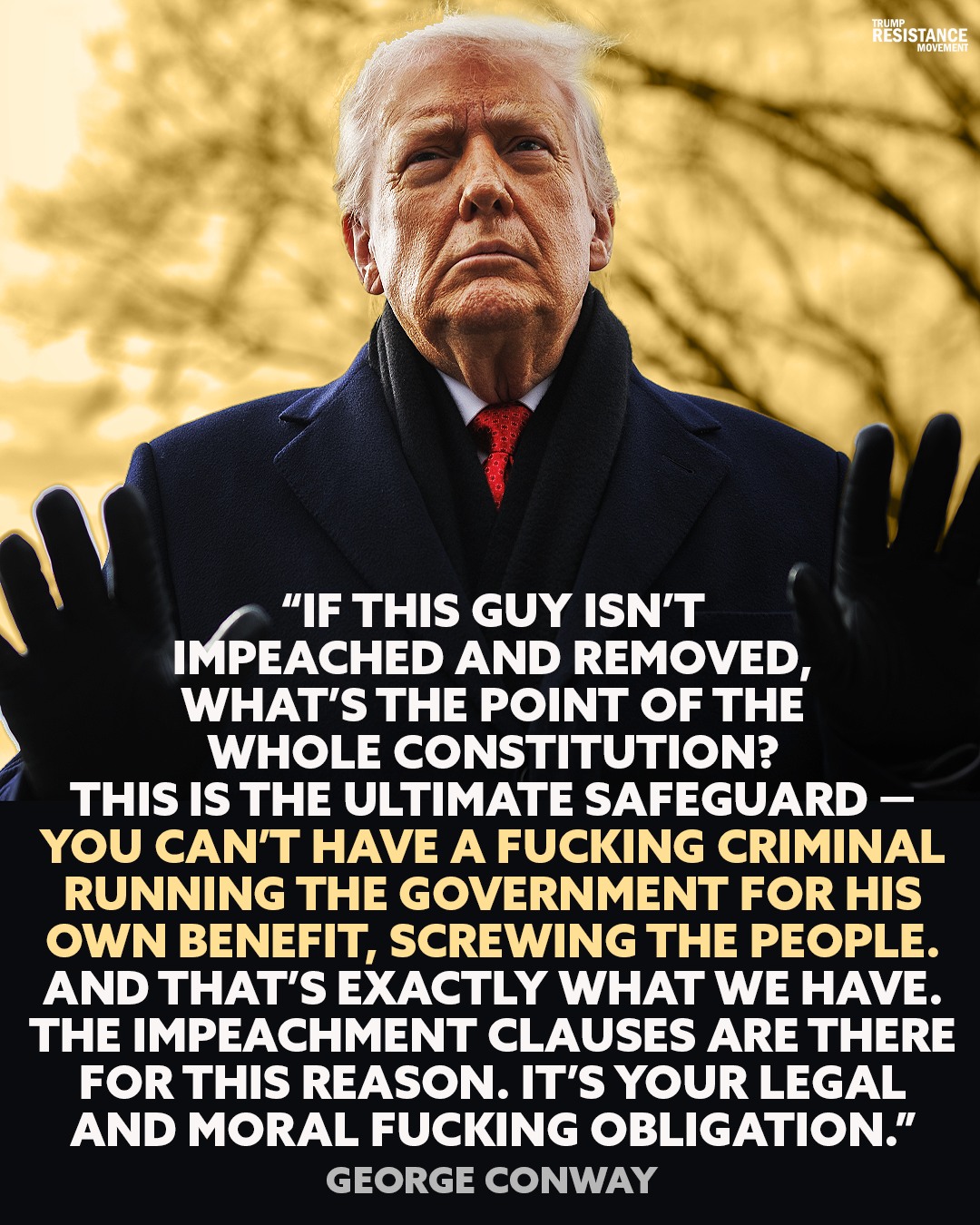 We could be immediately emancipated from the clutches of a heartless, joyless, dementia-brutalized sociopath if our elected leaders had the courage to abandon their unwavering tribalism, to stop worrying about saving their own political asses, and to do what the entire world knows they should do, and is waiting for them to do.