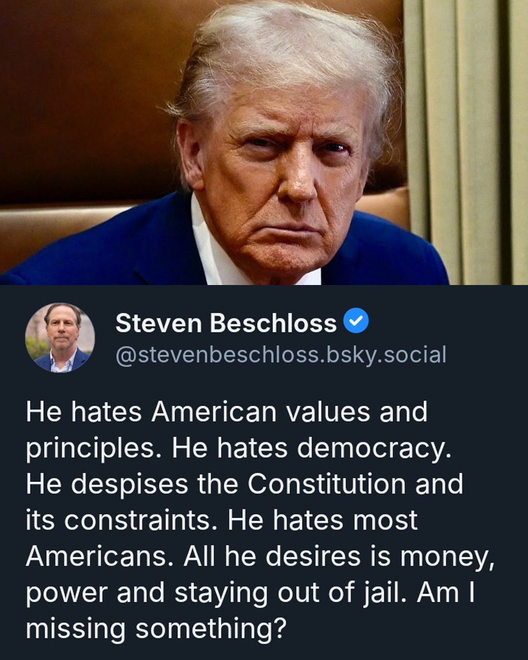 Decades of sexual abuse trail you, and a jury has already found you liable. Your own words and actions leave no doubt: you are not misunderstood, you are dangerous, and you have no regard for anyone you harm. You survive by lying, deflecting, and weaponizing every accusation, turning every consequence into fuel for your rallies while ignoring the suffering of every victim.