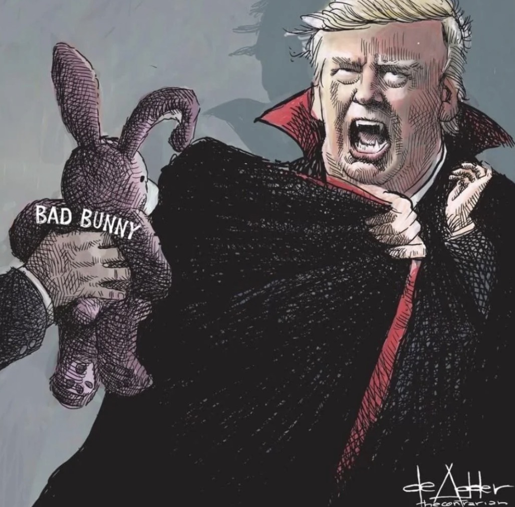 look, Bad Bunny — if that even is your real name — MAGA hasn’t spent the last ten years hard at work transforming American into a failed fascist pesthole, only to have you fuck it all up by telling everybody there’s something better than hate.