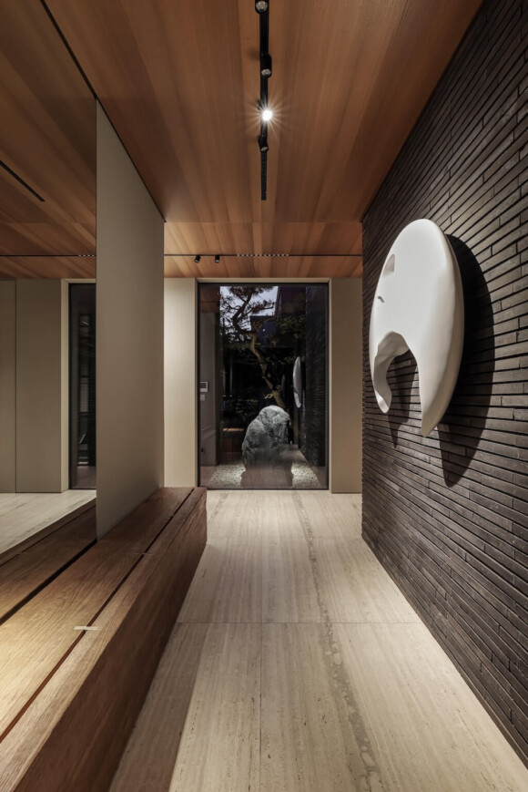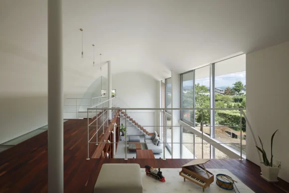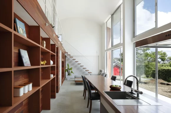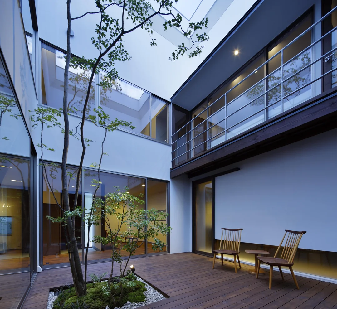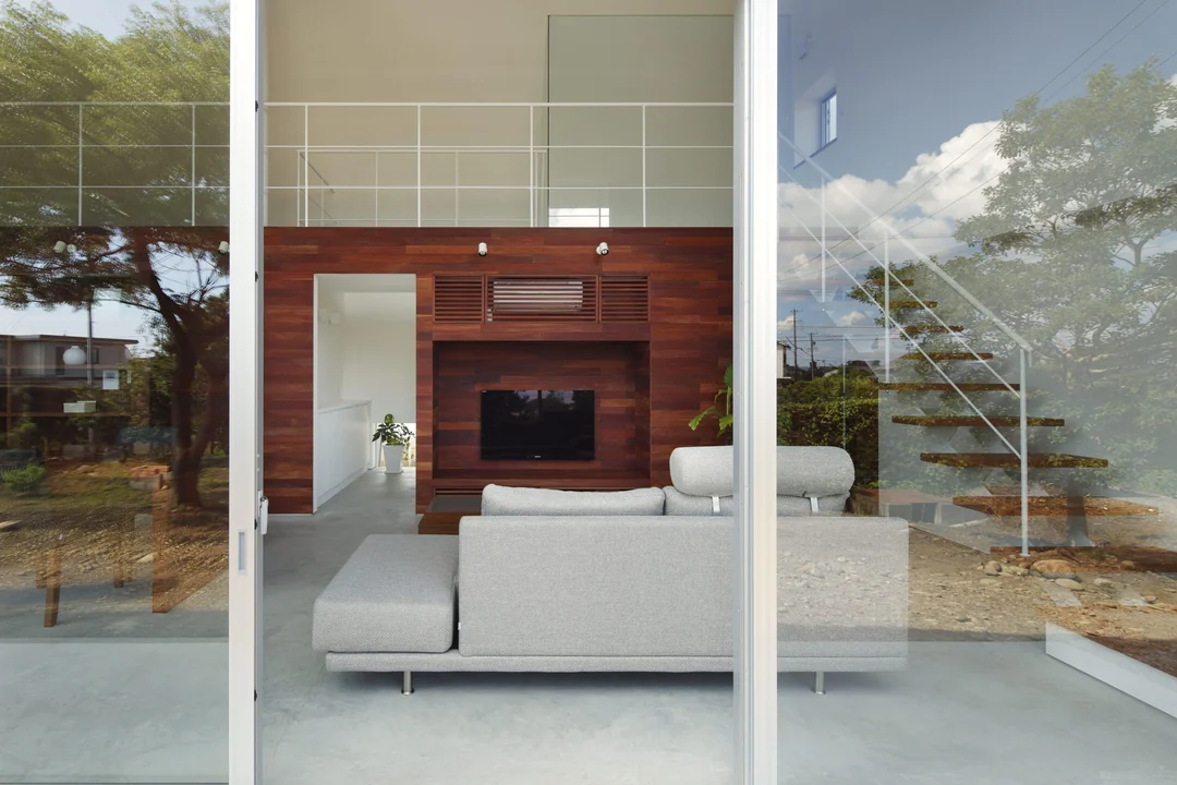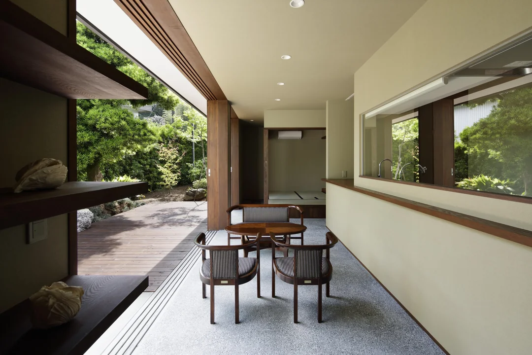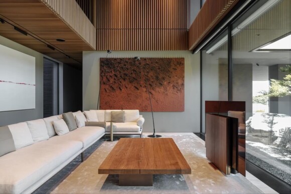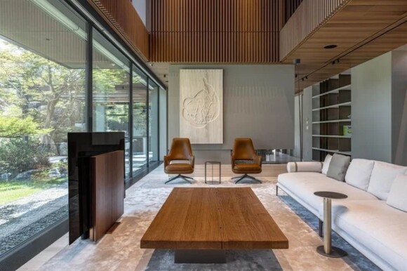 Set in a seismically active zone, Yumenomori showcases adaptive engineering and a deep respect for nature. Its facade features vertical wooden slats, terraces, and garden elements inspired by Japanese landscaping, creating harmony between the built and natural environments. A polished forest rock, placed in a symbolic garden and visible through expansive glass walls, anchors the home spiritually and visually.