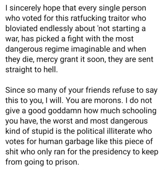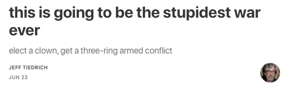 these are all deeply unserious people who are in way over their heads — and because Dear Leader decided to stick his dick into a hornet’s nest in the Middle East, they now have to pretend that all wars — like trade wars — are good, and easy to win.