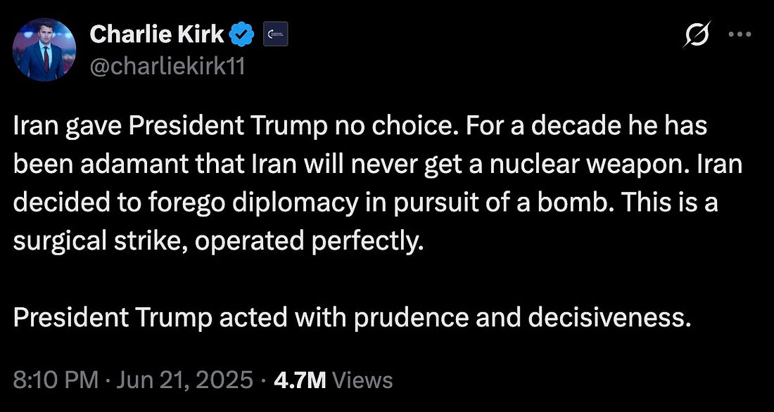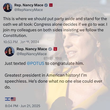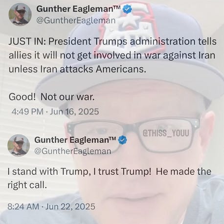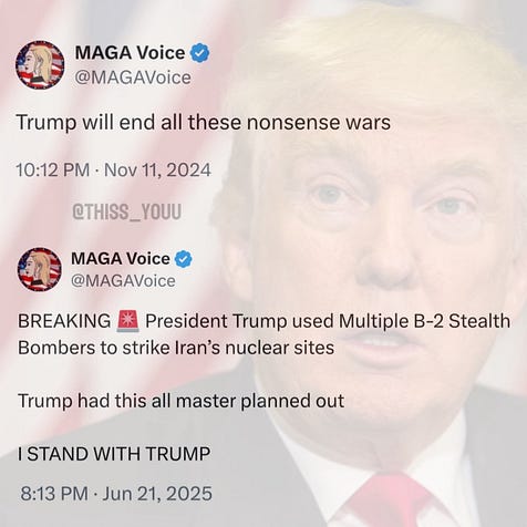 let’s go out with a laugh, as we watch MAGA fall all over themselves in a mad dash to memory-hole any anti-war sentiment they might have once expressed, and proclaim fealty to Dear Leader’s new reality.