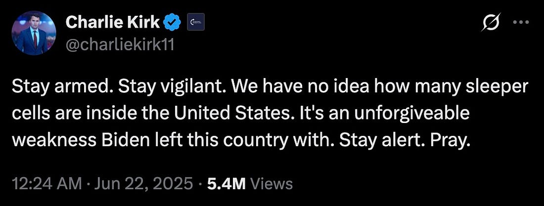“Stay armed. Stay vigilant. We have no idea how many sleeper cells are inside the United States. It’s an unforgiveable weakness Biden left this country with. Stay alert. Pray.”