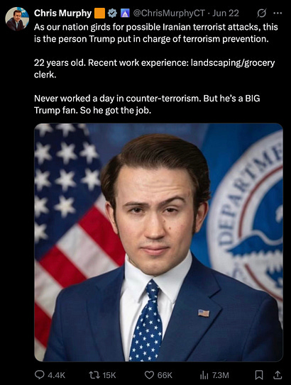 “As our nation girds for possible Iranian terrorist attacks, this is the person Trump put in charge of terrorism prevention. 22 years old.
