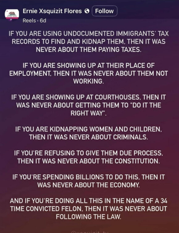 He is Stephen Miller, Kristi Noem, JD Vance, and Derek Chauvin. He is the person trying to convince you at this very moment that she was a domestic terrorist and he did what he had to do. There is video. By defending it, you are essentially saying that this is also how you should react to a car slowly turning away from you. Fuck you.” ~ jake._.luck on Instagram