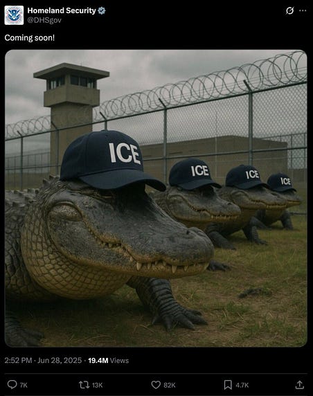 “tomorrow, President Trump will travel to the great state of Florida, to attend the opening of a new illegal alien detention center located at Dade-Collier training and transition airport… the facility is in the heart of the Everglades, and will be informally known as ‘Alligator Alcatraz.’ there is only one road leading in, and the only way out is a one-way flight. it is isolated and surrounded by dangerous wildlife — an unforgiving terrain. the facility will have up to five thousand beds, house, process and deport criminal illegal aliens. this is an efficient and low cost way to help carry out the largest mass deportation campaign in American history.”