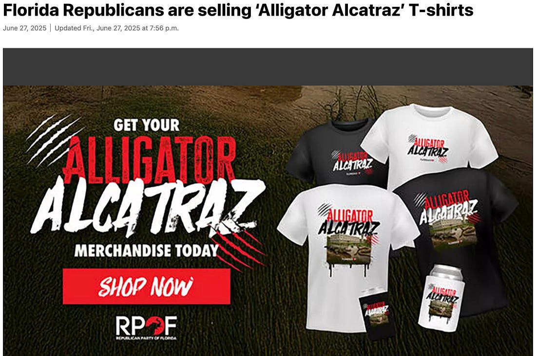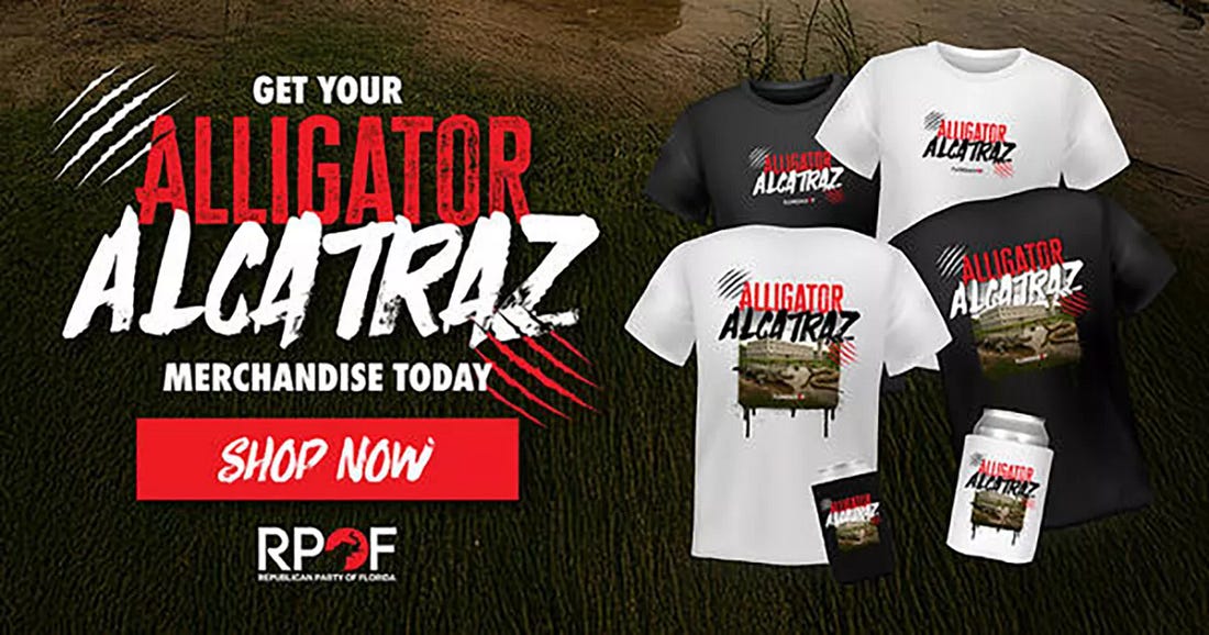 ‘Alligator Alcatraz’ — isn’t that name totally adorbs? — is the brainchild of Florida Governor Ron DeSadist. he commandeered a decaying, abandoned airport in the middle of hot, humid, mosquito-, alligator- and python- infested South Florida swampland, hastily put up a few hundred tents, and declared that America’s newest concentration camp is open for business.