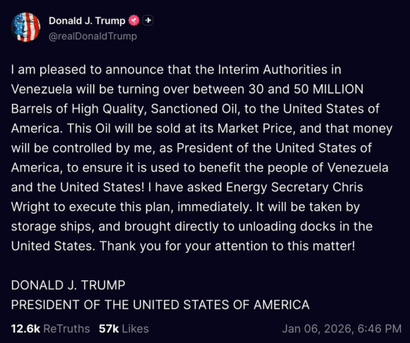 I am pleased to announce that the Interim Authorities in Venezuela will be turning over between 30 and 50 MILLION Barrels of High Quality, Sanctioned Oil, to the United States of America. This Oil will be sold at its Market Price, and that money will be controlled by me, as President of the United States of America, to ensure it is used to benefit the people of Venezuela and the United States! I have asked Energy Secretary Chris Wright to execute this plan, immediately. It will be taken by storage ships, and brought directly to unloading docks in the United States. Thank you for your attention to this matter!