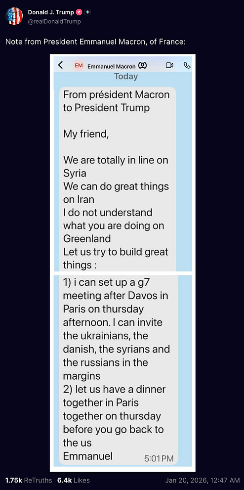 yet the flattery and kowtowing goes on, right up to into the new year. we even saw it yesterday, in the text message from Macron that Donny posted on his shitty app. look at this obsequious drek.