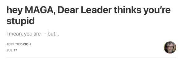 as he’s done so many times in the past, Donny’s made things worse for himself. what he should have said was nothing — because let’s face it, the cultists are dumb as fuck, and they’re easily distracted. if Donny had played this right, the whole thing would have already burned itself out, and MAGA would have moved on to the next shiny object. but Donny can’t ever keep his rancid anus-mouth shut, and by calling his cultists stupid weaklings whose support he no longer wants, he’s once again shoved his dick into a hornet’s nest and clownfucked it into a frenzy.