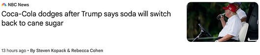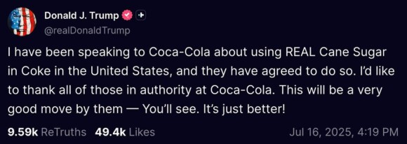 “I have been speaking to Coca-Cola about using REAL Cane Sugar in Coke in the United States, and they have agreed to do so. I’d like to thank all of those in authority at Coca-Cola. This will be a very good move by them — You’ll see. It’s just better!”