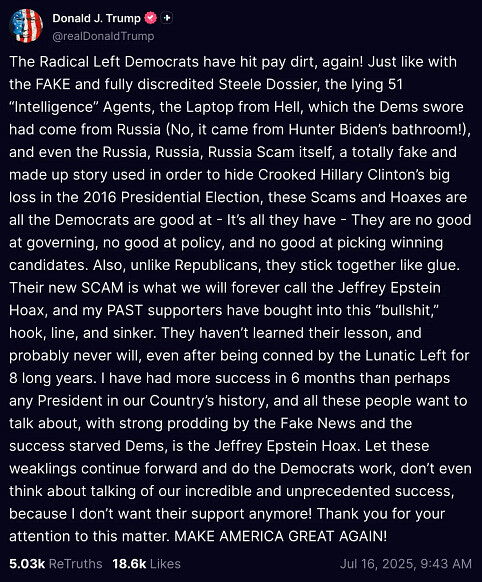 Then on Friday evening–the 4th of July holiday weekend–Bondi quietly announced, “Hey gang, guess what, there IS no client list! Oopsie! Also? Epstein killed himself! So case closed! How about those Red Sox, huh?!”