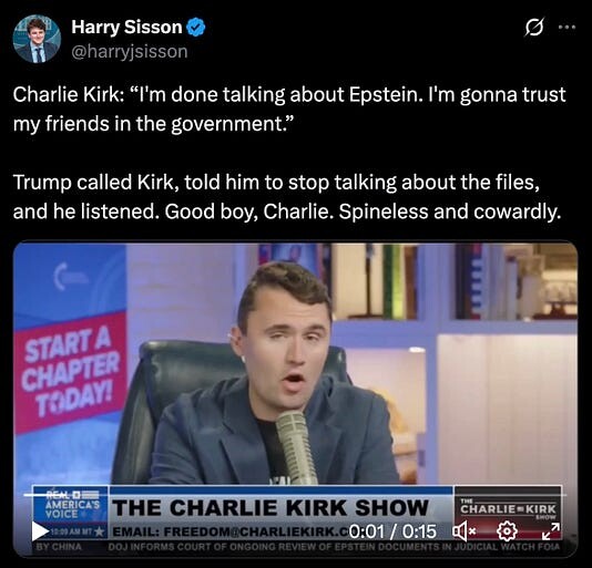 by the way, this year’s Nobel Prize in Taking One For The Team definitely should go to Juliet Jeske, the host of Decoding Fox News podcast. she selflessly watched the entire Turning Point show, so we wouldn’t have to. she then edited it down into a two-minute highlight reel and added a commentary track. you can see it here.