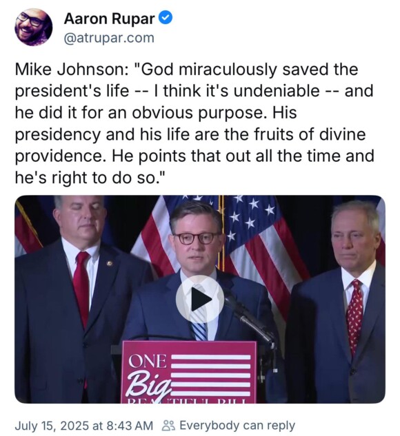 come on, reporters. why are you bothering Holy Mike, when he’s busy praying? it’s not like he can do anything about the situation. it’s not like he’s a member of government. it’s not as if he wields the Speaker’s gavel. it’s not like he could have wadded up any of the Mad King’s unconstitutional executive orders, and declared he was using his congressional power to override them. it’s not as if he could have told the Space Nazi to put down his chainsaw and get his pimply incel DOGE dipshits the fuck out of town. it’s not as if he could have told Donny to shove his big, beautiful bill up his ass, and announced that he wasn’t going to vote to fund any of that Police State bullshit.