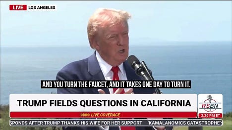 oh, speaking of that ginormous fucking faucet that absolutely exists in Canada — remember when Los Angeles burned to the ground and Donny tortured Gavin Newsom over it, blaming him for running California like some commie rat bastard, and threatening to withhold disaster relief funds until Newsom opened that imaginary faucet?