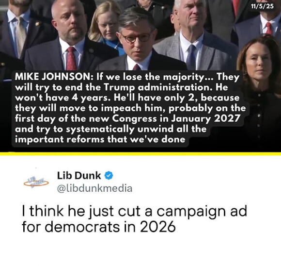 worse than any of that, Johnson has completely abdicated the House Speaker’s Constitutionally-ordained role as a check on the presidency. he’s let a fluorescent tangerine Mad King run wild, never once blocking any of his fuckbrained schemes. whatever Donny wanted — no matter how obviously ruinous — was fine with Mike. incoherent tariffs? go for it, Dear Leader. unconstitutional executive orders? you do you, bro. fire all the experts and replace them with morons? sounds good to us. prosecute political enemies? knock yourself out. kick millions of people off their healthcare so that gazillionaires can have another tax cut? what could possibly go wrong?