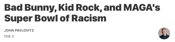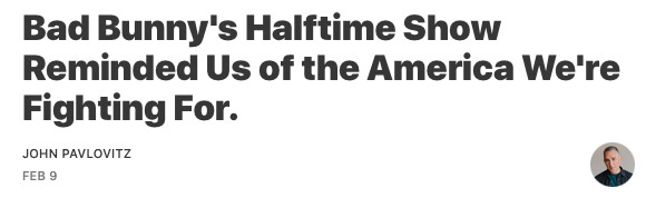 The fact that the Right feels compelled to create an “alternative” to Bad Bunny’s Super Bowl appearance speaks eloquently about their desire to secede from a culturally and racially diverse nation, how committed they are to perpetuating the myth of oppressed white Christians, and how determined they are to manipulate every event into a racist holy war in order to keep their rank-and-file foaming at the mouth.