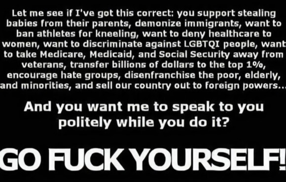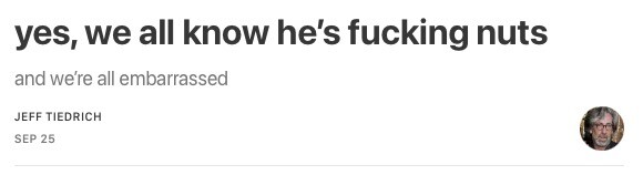 well, obviously, not the cultists, they eat this shit up — but to the other 70% of us who aren’t brain dead, we know it. we’re the ones who have to sit here, day after day, as the firehose of batshit gets sprayed point-blank into our faces.