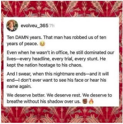 I don’t have to tell you just how monstrously evil all of this is. I don’t have to tell you that in just nine short months, a loathsome bully has turned our country into a mockery of what America is supposed to be about.