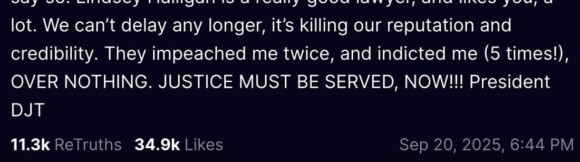 fact check: oh please, just fuck straight off. we all saw what you posted to your janky app, Donny. look how it ends, with a demand that Bondi ‘serve justice.’