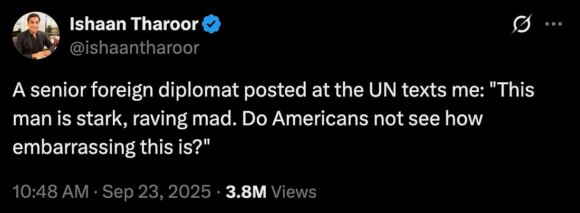 at the United Nations on Tuesday, as America’s Fuckwit-in-Chief was blithering incoherently about Chinese wind and hell-bound countries and how awesome it is to bomb the shit out of fishing boats and how he deserves all the Nobel Peace Prizes and how everyone at the UN is a poopyhead for not letting him renovate their building, a foreign diplomat took out his phone and texted the following to an American journalist.