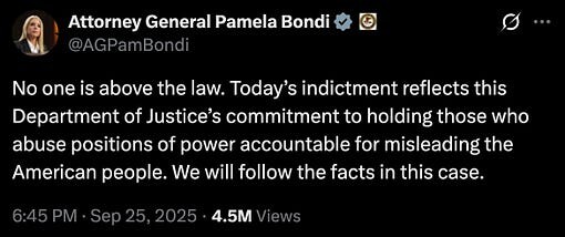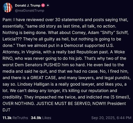 we all saw that thing Donny posted by mistake on his crappy app, where he ordered Pam Bondi to indict Comey, and told her that if she didn’t do it, he’d find someone who would.