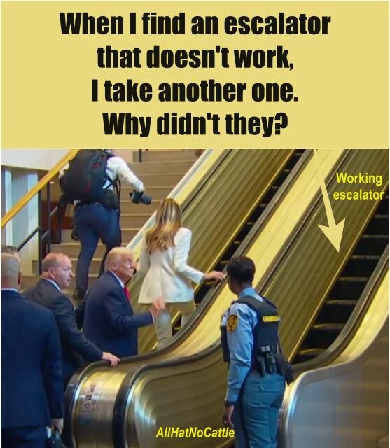 EscalatorGate™ is now in its third day and shows no sign of abating — and in typical Donny carnival-barker style, the story of how an escalator briefly turned into stairs gets more outlandish with each retelling.