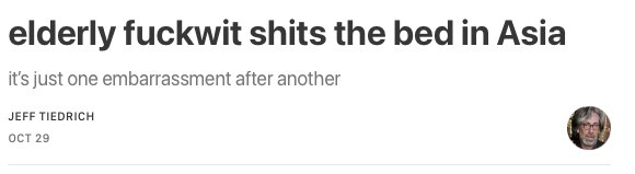 Christ on a corn cob, Sundowning Grandpa Befuddlepants hasn’t the slightest clue what planet he’s on. seriously, subjecting this goofus to days of events halfway around the world is just elder abuse at this point.