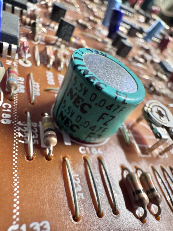 The new caps arrived today and after doing a test fit to make sure the legs lined up with the holes in the board, I desoldered the old one and soldered the new cap in place.