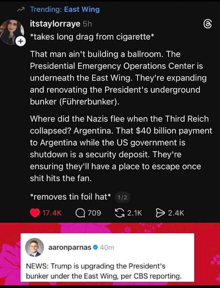 Then over the weekend, posts began to appear on social media describing that very thing. What I didn’t know was that the East Wing was already home to the existing emergency bunker, from which he hid out during various riots and uprisings.