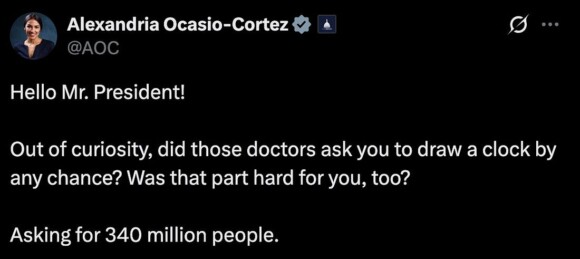 “they have Jasmine Crockett, a low-IQ person. they have, uhhhh— AOC, she’s low-IQ. you give her a— an IQ test— have her pass, like, the exams that I decided to take when I was at Walter Reed. those are very hard, uh, they’re really aptitude tests, I guess, in a certain way, but they’re cognitive tests. let AOC go against Trump. let Jasmine go against Trump. I don’t think g— Jasmine— the first couple of questions are easy. a tiger, an elephant, a giraffe. when you get up to five or six and then when you get up to twenty and twenty-five— they couldn’t come close to answering any of those questions.”