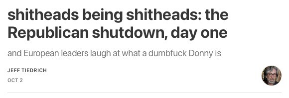 yesterday was the first day of the Republican shutdown of our government, and Republicans spent it doing what they always do: swanning about like utter fucking shitheads, and shitheading up a storm.